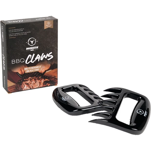 Ob Hähnchen oder Schwein, die BBQ Claws – Pulled Pork Krallen von Moesta-BBQ werden zum Zerteilen oder Zerrupfen von fertig gegartem Fleisch verwendet. Ebenso gut sind sie als Schneidehilfe oder auch zum Transport von großen Fleischstücken geeignet. Die Fleischkrallen sind aus hitzebeständigem Kunststoff gefertigt und halten Temperaturen bis 130° Celsius aus. Sie sind dazu gedacht um ganze Braten, Hähnchen und generell große Fleischstücke sicher vom Grill zu heben. Dank der spitzen Enden wird das Grillgut sicher gehalten. Der Haupteinsatzbereich ist aber natürlich das Zerteilen, bzw. Zerrupfen von Pulled Pork. Vor allem, wenn man große Mengen Pulled Pork macht, geht es mit den Meat Claws deutlich schneller als mit einfachen Gabeln. Auch der Spaß und die Blicke der Gäste sind das wert. Als Bärentatzen sind die Kunststoff-Fleischgabeln seit vielen Jahren in den USA erhältlich, jetzt auch in Deutschland. Sie sind spülmaschinenfest, leicht zu reinigen und bieten höchste Temperaturbeständigkeit. Für den ambitionierten Griller ist dieses nützliche Gadget auch eine tolle Geschenkidee.