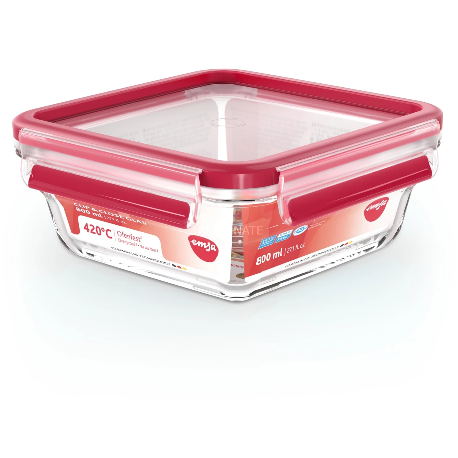 Bestpreis 😀 Frischhaltedosen Emsa CLIP & CLOSE Glas-Frischhaltedose 0,8 Liter (transparent/rot, Quadratisch) ⭐