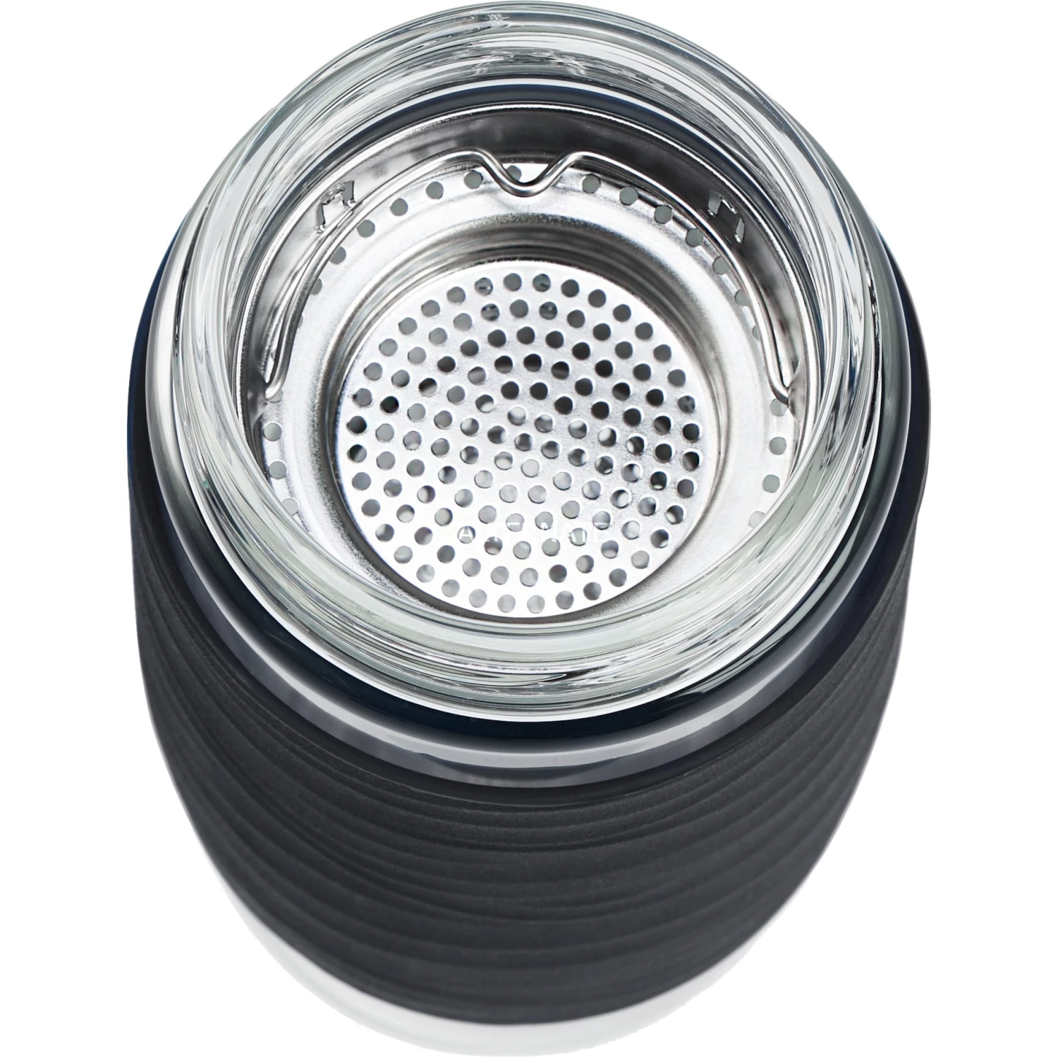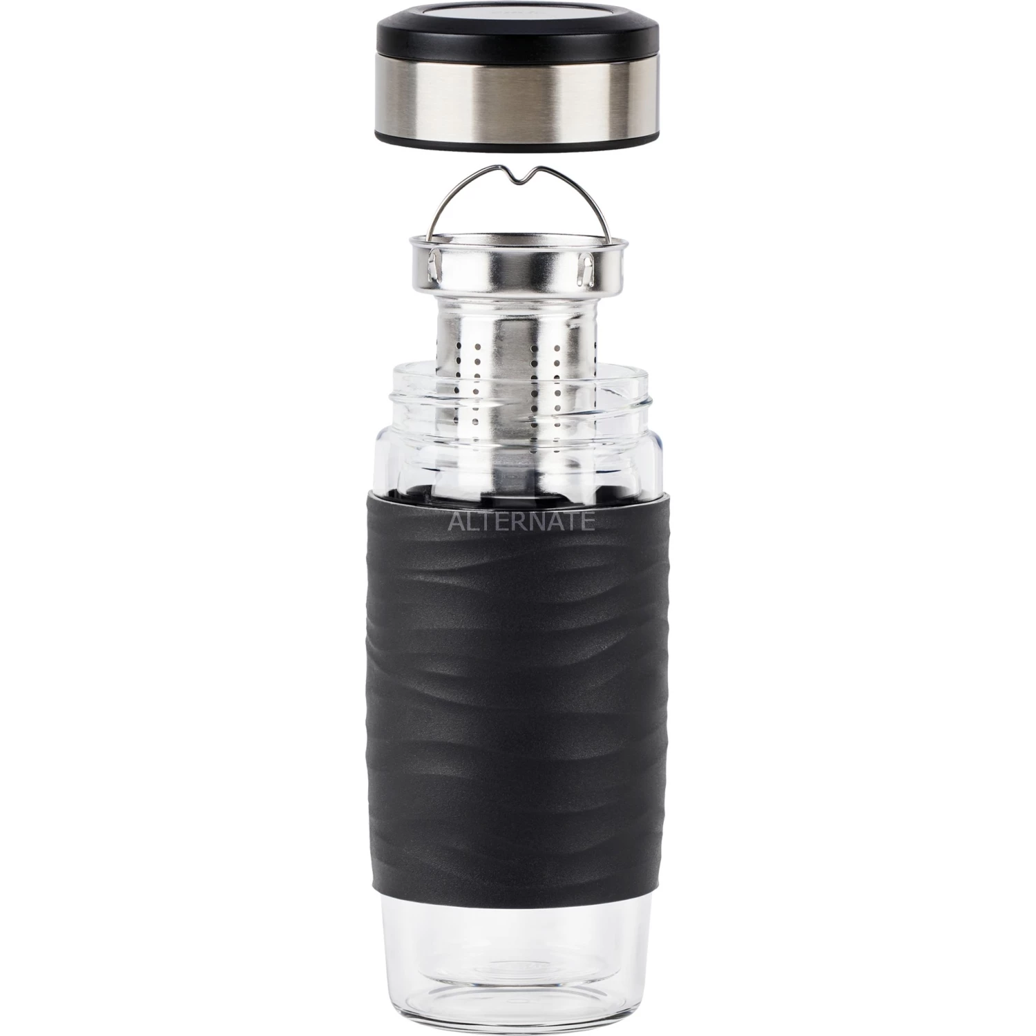 Der Thermo-Teebecher TEA MUG in der Farbe „schwarz“ ist der ideale Begleiter für unterwegs, ob auf dem Weg zur Arbeit, in die Schule oder beim Einkaufsbummel. Der TEA MUG Isolierbecher aus doppelwandigem Glas ist nicht nur in vielen Farben erhältlich, sondern auch 100% dicht. Die attraktive strukturierte Soft-Touch-Manschette mit Silikon-Ummantelung im Wellen-Design schützt vor Hitze und vor Stößen, bietet extrem viel Grip und sieht durch die peppigen Farben auch optisch richtig gut aus. Der Drehverschluss des TEA MUG lässt sich leicht öffnen, und dank dem intelligent konstruierten Verschluss kann man 360° rundum von jeder Seite trinken. Den Tee kann man ganz praktisch direkt im MUG aufbrühen, das Sieb trennt den Tee vom Wasser und dient als Filter. Der integrierte 2-in-1-Tee-Einsatz dient als Sieb zum Zurückhalten von Teeblättern und als Filtereinsatz für losen Tee, Gewürze, Zitrone oder Ingwer.